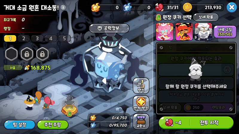 거대 소금 원혼 대소동은 원정 쿠키와 원정 쿠키에게 적용되는 랜덤 효과를 이용하여 제한된 시간동안 거대 소금 원혼에게 최대한 많은 대미지를 넣는 컨텐츠입니다.