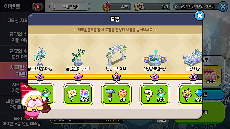- 건물 쾅쾅 망치, 되돌려라! 재건축 초콜릿, 설탕노움의 설계 도면, 시크릿 가든 입장권