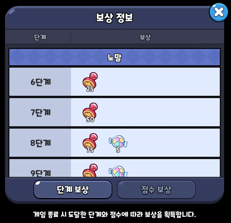 게임이 종료되었을 때 최고 도달 단계와 점수에 따라 보상을 얻을 수 있습니다.